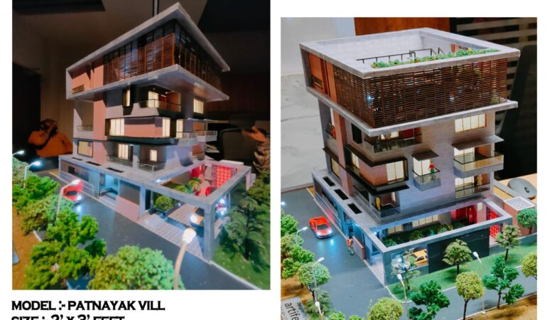 A compact yet detailed scale model of Patnayak Villa, a private residential project in Bhubaneswar. This 2′ x 3′ architectural model highlights elegant villa design and landscape elements, perfect for client presentations and design approvals.